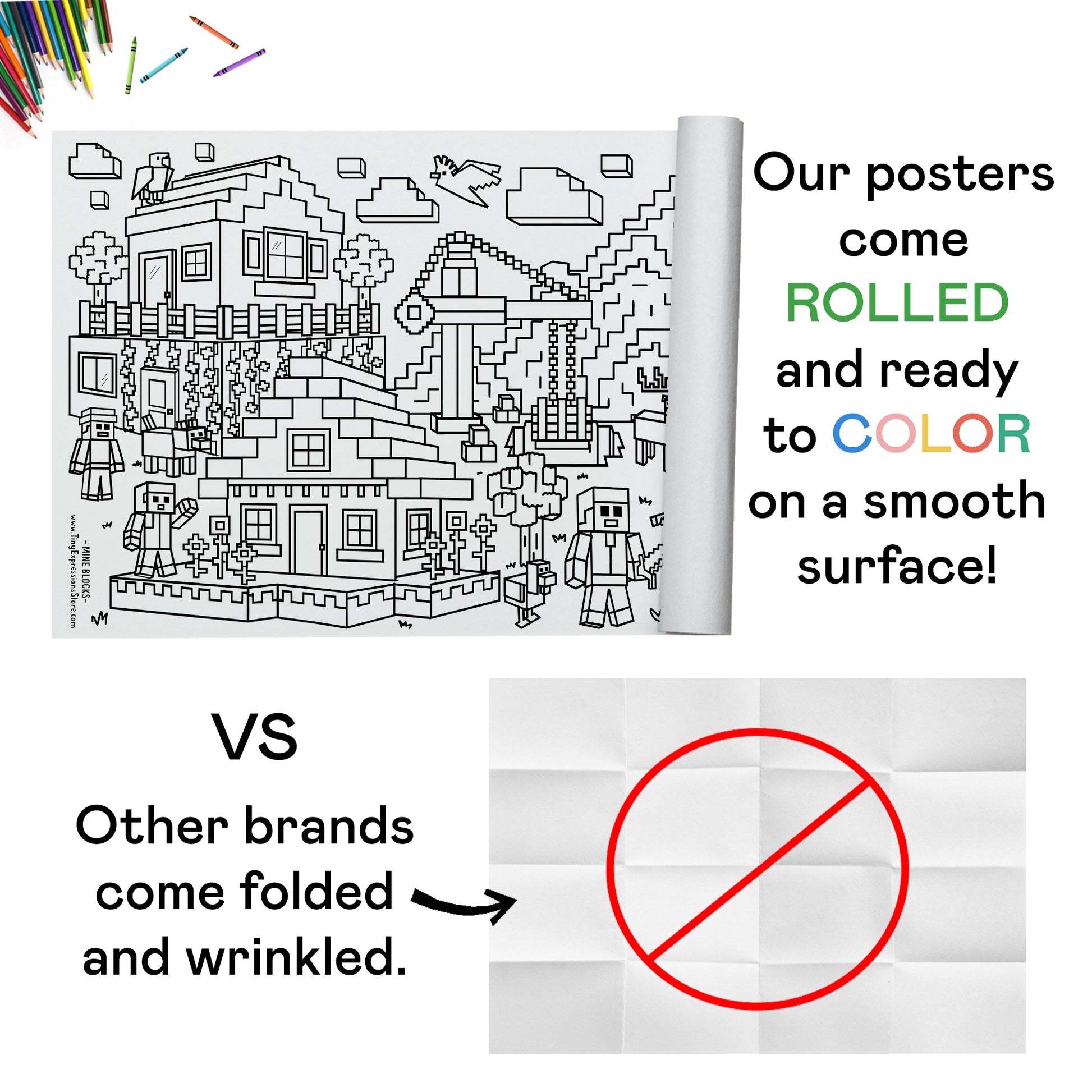 PARTY ACTIVITY – This poster is perfect for a mine blocks themed party. Lay it out on the table for a coloring tablecloth or hang it on the wall for vertical coloring and a fun party decoration!