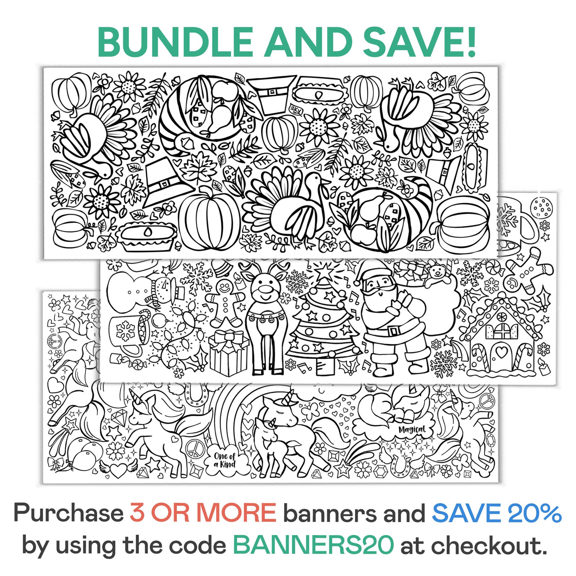 BIG COLORING BANNER - Your order includes one 30" x 72" inch large paper coloring poster. Its big size doesn't just help create a large arts and crafts area...it also can serve as a tablecloth, keeping your table clean from the kid's messes.