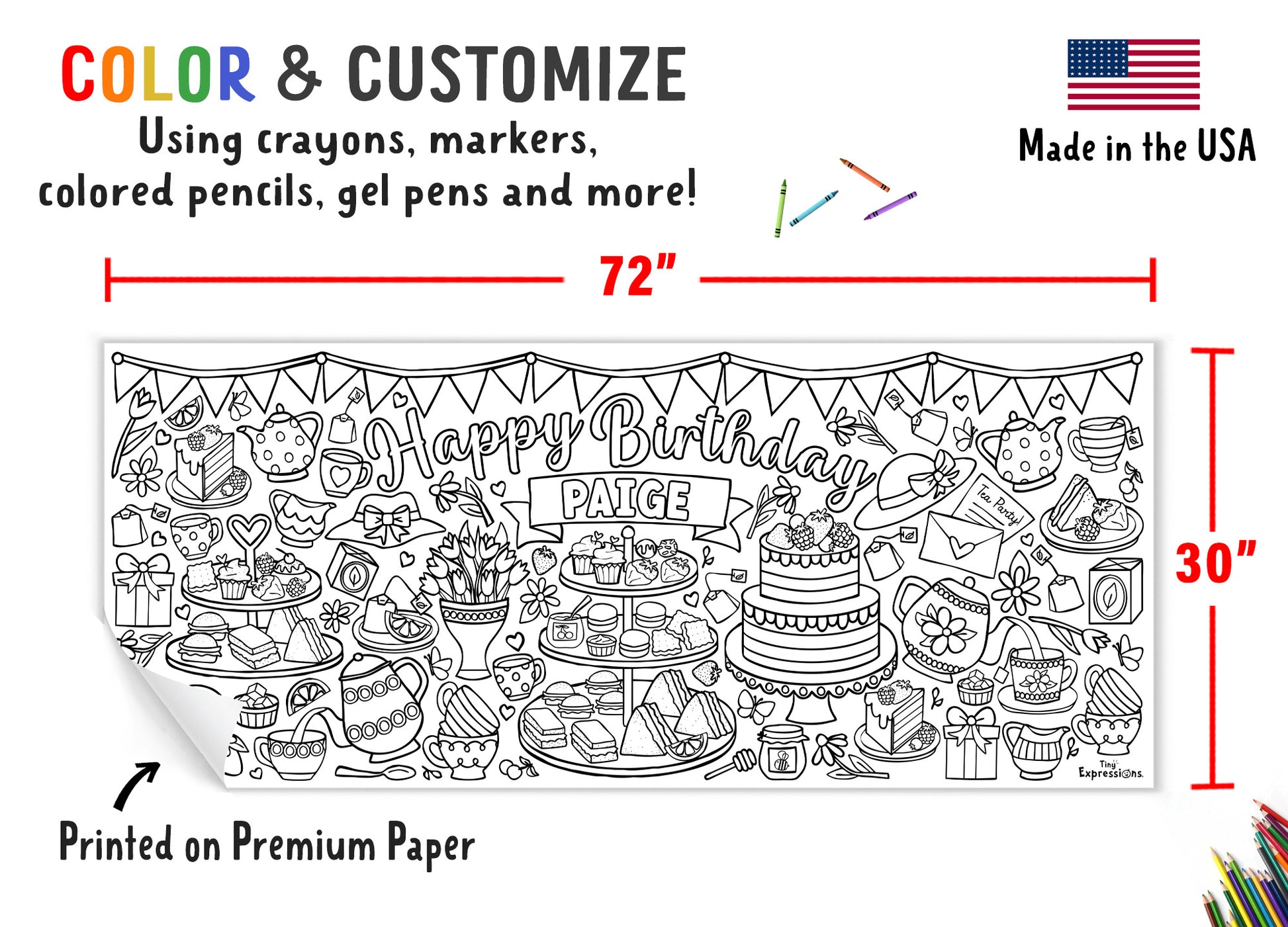 Host an unforgettable tea party with Tiny Expressions’ Giant Tea Party Coloring Banner! This jumbo 30" x 72" poster features charming designs of teapots, teacups, cakes, flowers, hats, and more for both young and adult artists to enjoy coloring. Personalize it with your child's name for a delightful surprise! Make your tea party extra special with this unique, customizable banner!